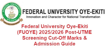 Read More 6 views3 minute read Admissions & Exams Federal University Oye-Ekiti (FUOYE) 2025/2026 Post-UTME Screening Cut-Off Marks & Admission GuideByAbdulNovember 7, 2025No comments The Federal University Oye-Ekiti (FUOYE) has officially released the departmental Post-UTME cut-off marks for the 2025/2026 academic session.… Read More 0 0 0
